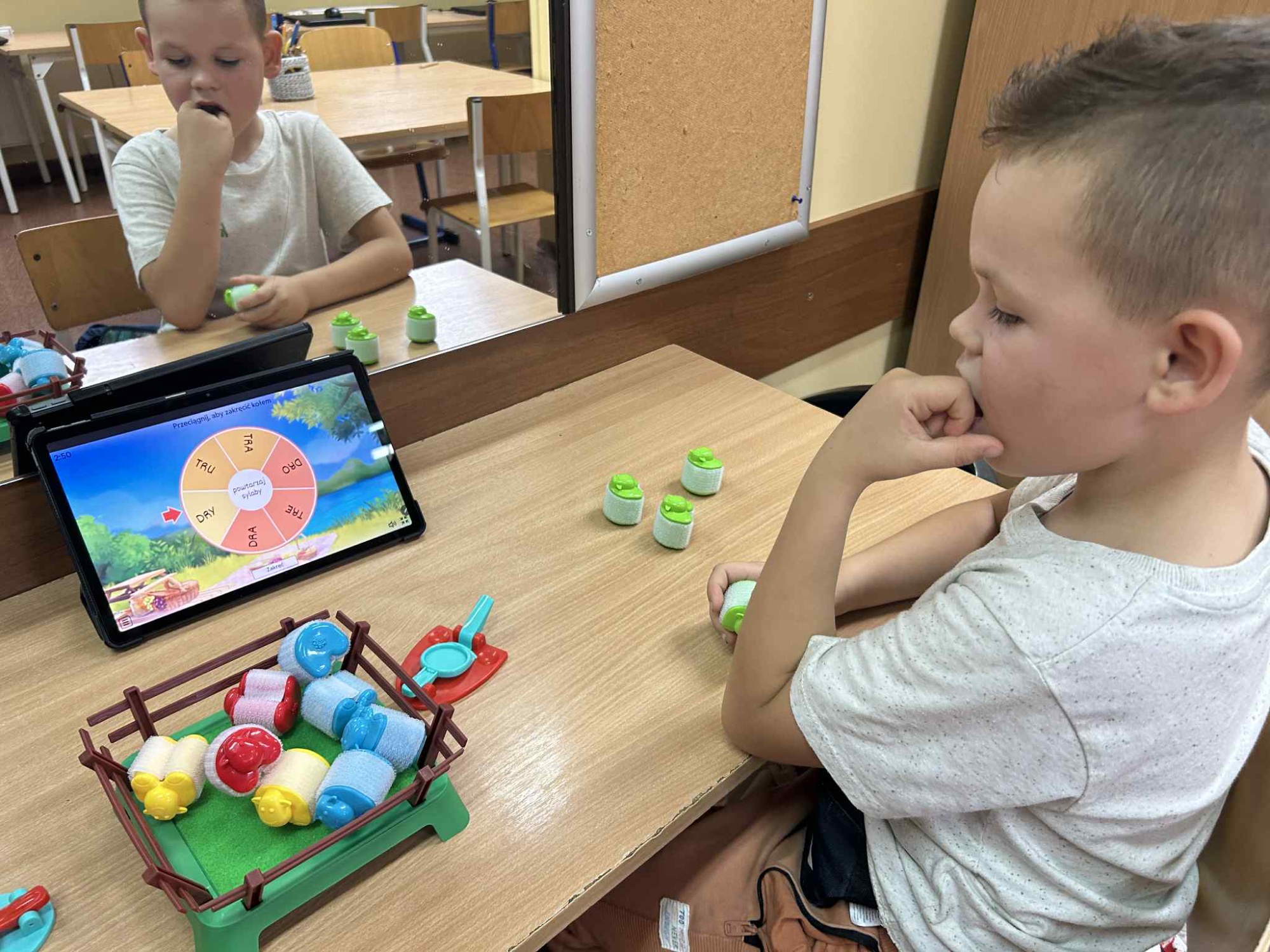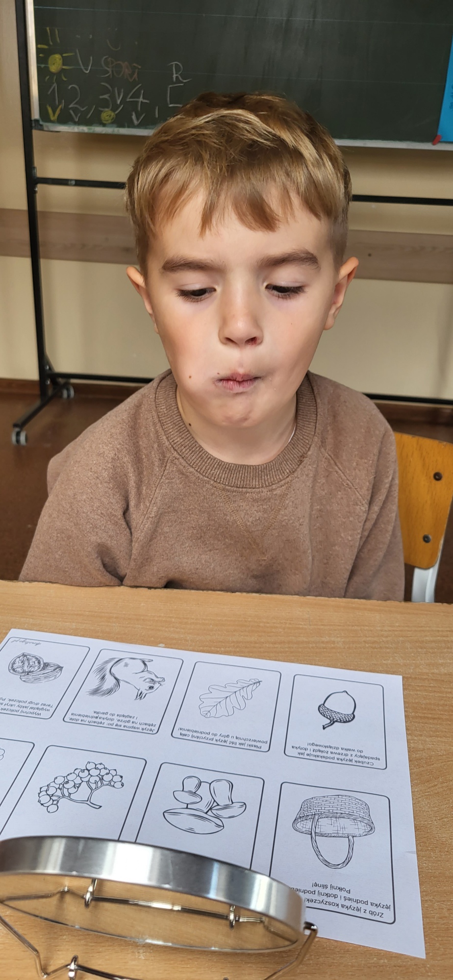 W ramach zabawy "Odszukaj i nazwij", dzieci miały za zadanie odnaleźć wśród obrazków te, które zawierały wybrane głoski, a następnie poprawnie je nazwać. Ćwiczenie wspierało analizę słuchową, rozpoznawanie głosek w nagłosie i śródgłosie oraz rozwijało zasób leksykalny.